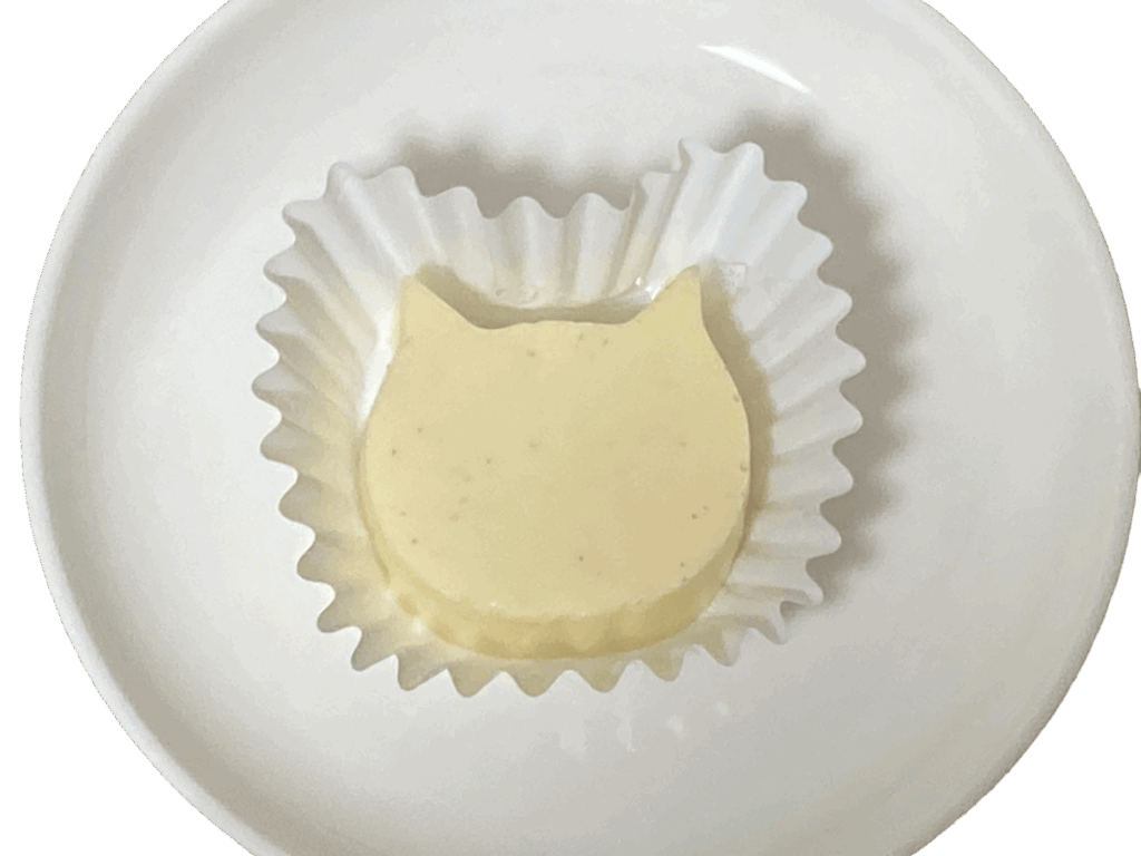 猫の顔の形のチーズケーキです。パッケージに書いてある通り、「スプーンで食べる」のにちょうどいい柔らかさです。