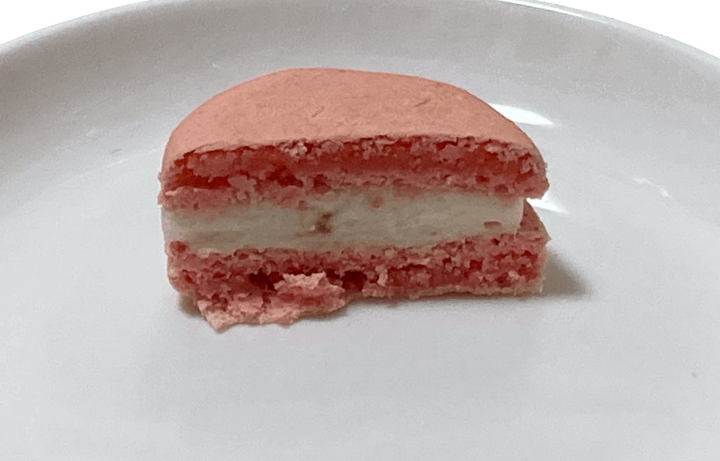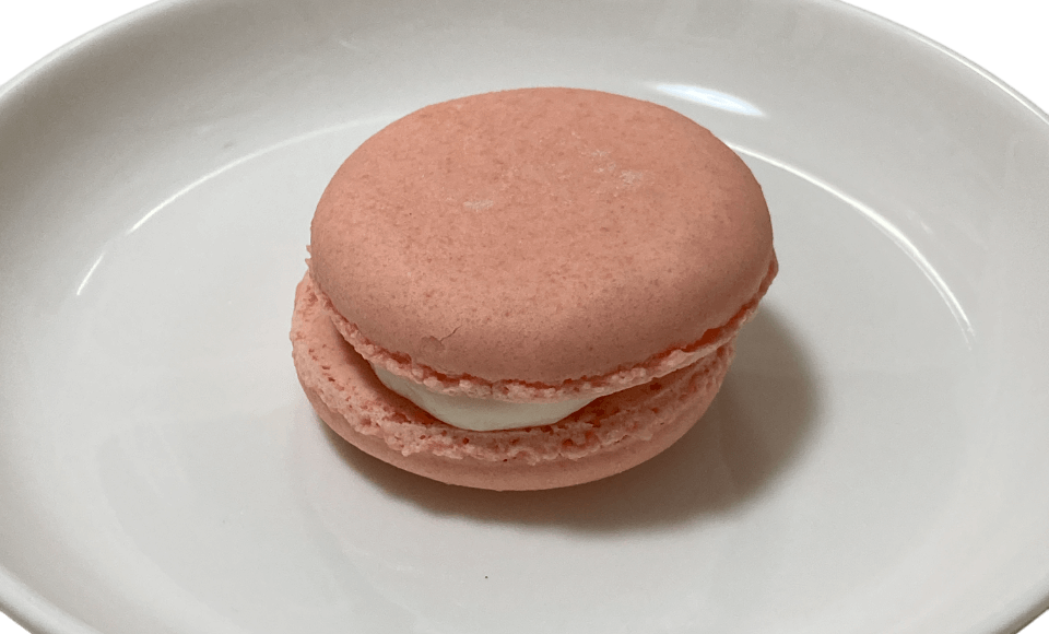 サクサクのマカロン生地に桃の味がついています。中のクリームにも桃の果肉が見えています。一緒に食べると、より一層桃の香りがして美味しいです。