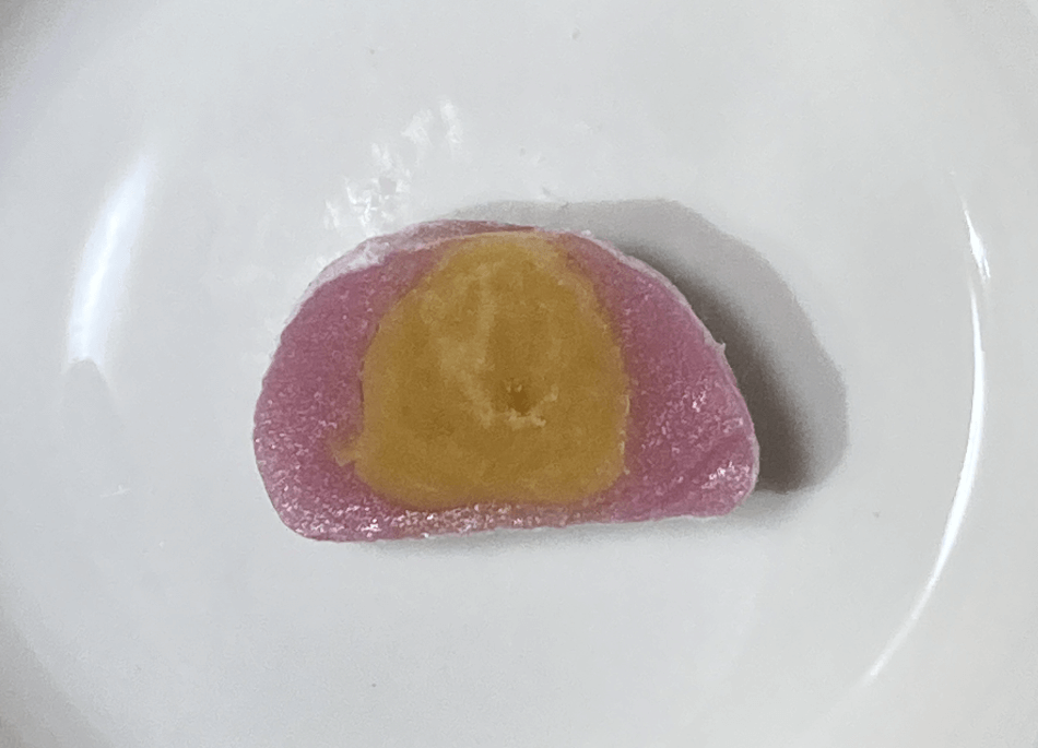 大福も桃の味がします。中のあんからも桃の味がして、ダブルで楽しめます。あんが上品な甘さで、大福部分も厚めなので、ちょうど良い食べやすさです。