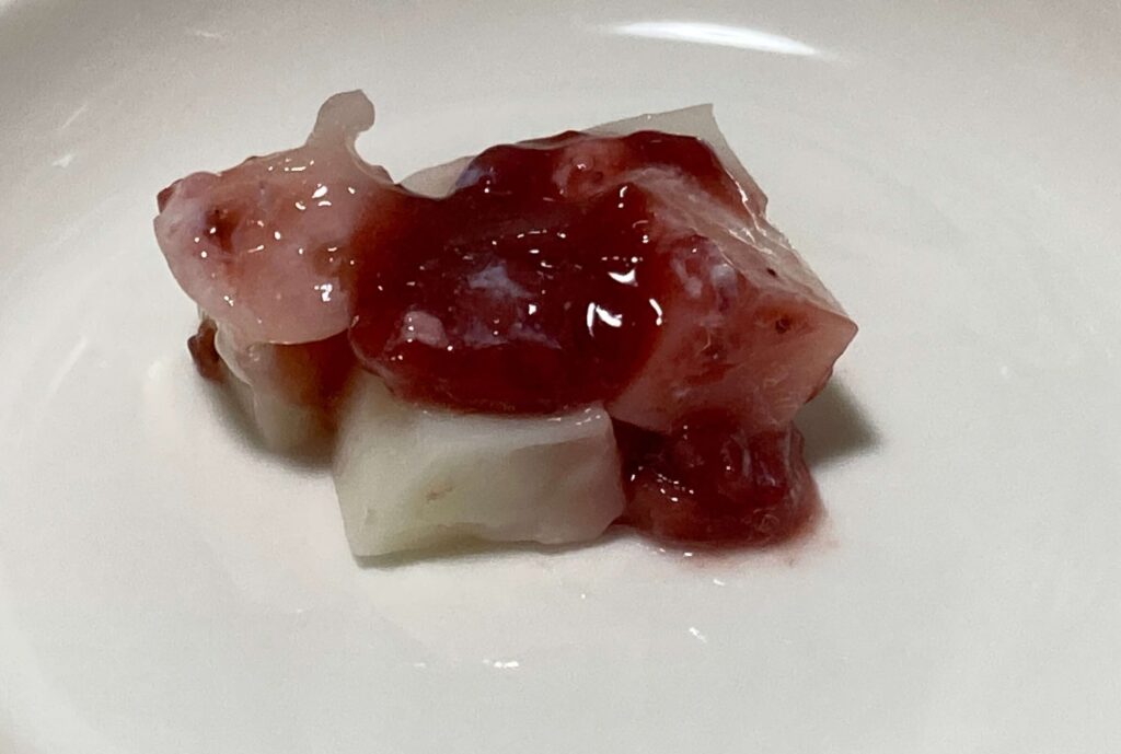 ミルクのわらびもちにたっぷりのいちごソースがかかっています。いちごソースは果肉入りです。真ん中あたりにはミルクソースも少し入っています。
