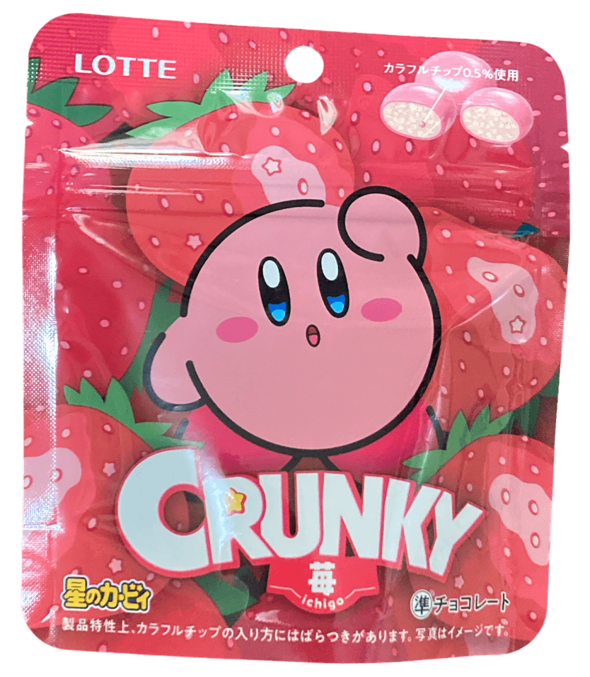 11/18発売のカービィが目印のパッケージのクランキーです。手に付きにくく加工されており、作業しながらでも食べやすいです。苺味で、クランキーらしいザクザクとした食感が特徴です。15個程度入っています。