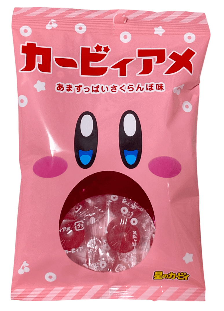 11/18発売のパインアメとコラボした「カービィアメ」です。さくらんぼ味になっており、カービィらしいピンク色が特徴です。アメの形状はパインアメと同様にドーナツ型をしていて、厚みがあります。甘酸っぱい味わいのアメです。