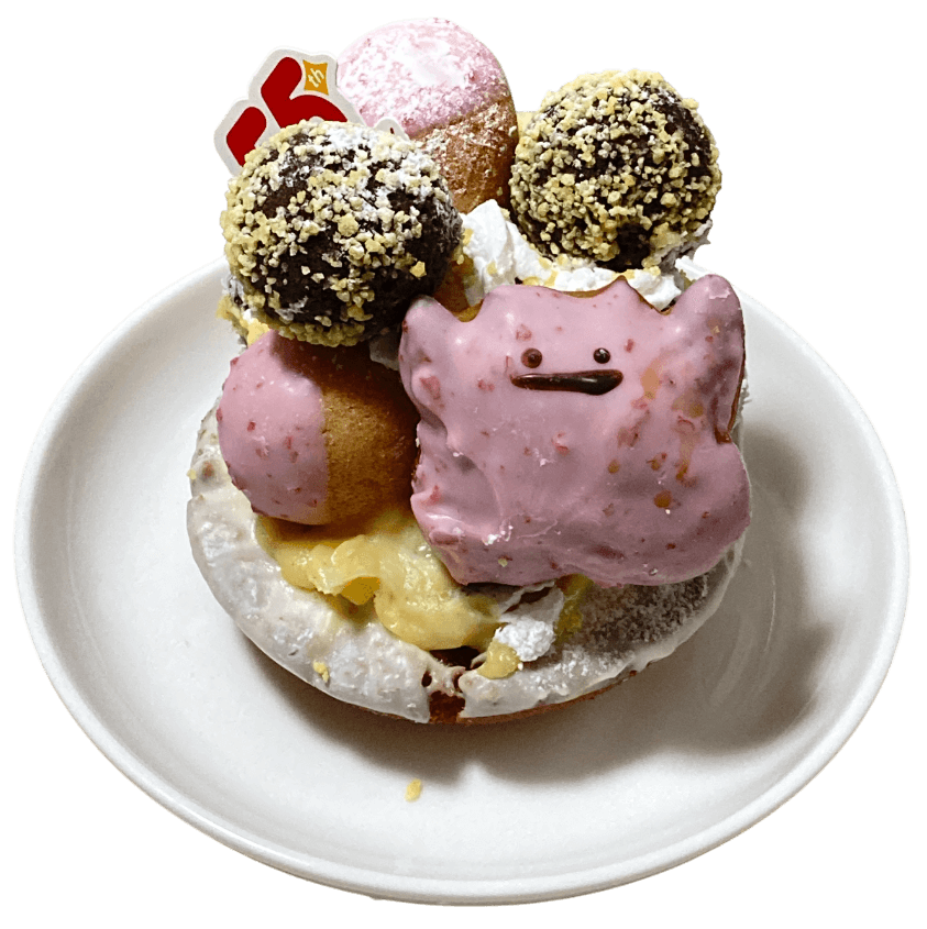 オールドファッションの土台には、ホワイトチョコがかかっており、その上にあるカスタードクリーム、ホイップクリームでポップドーナツやメタモンを固定しています。